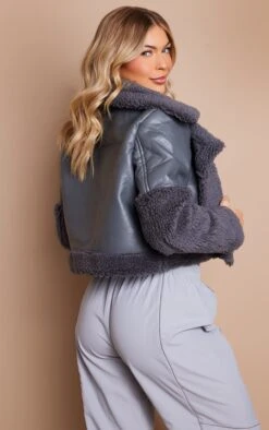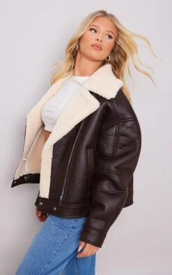 Prettylittlething Chocolate Faux Leather Borg Lined Biker Detail Aviator Jacket Chocolate