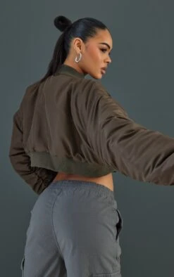 Prettylittlething Dark Khaki Cropped Ruched Sleeve Utility Pocket Bomber Jacket Dark Khaki