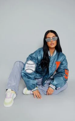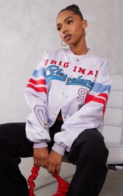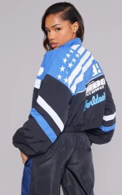 Prettylittlething Bright Blue Cropped Oversized Graphic Zip Up Racer Bomber Jacket Bright Blue