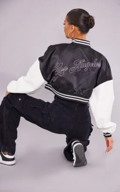 Prettylittlething Black Stripe Trim Contrast Sleeve Satin Cropped Varsity Bomber Jacket Black