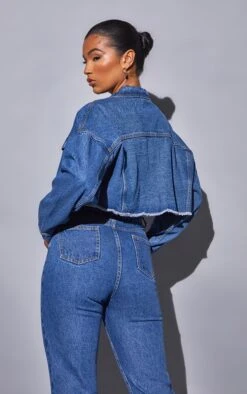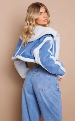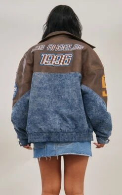 Prettylittlething Mid Blue Wash Denim Faux Leather Mix Badge Detail Bomber Jacket Mid Blue Wash