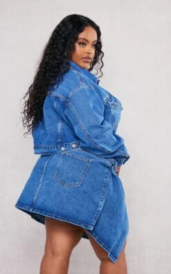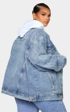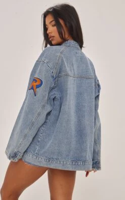 PRETTYLITTLETHING Mid Blue Wash Oversized Boyfriend Pocket Detail Denim Jacket Mid Blue Wash