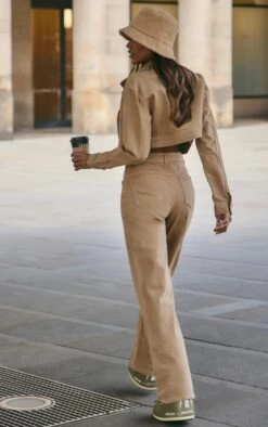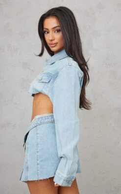 Prettylittlething Petite Light Blue Wash Distressed Super Cropped Denim Jacket Light Blue Wash