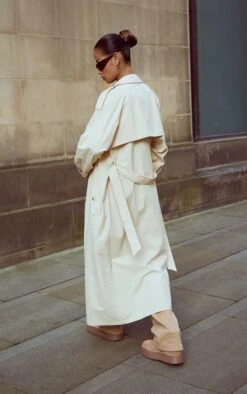 Prettylittlething Stone Panel Detail Belted Trench Coat Stone