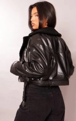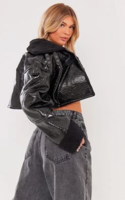Prettylittlething Black Borg Lined Vinyl Cropped Jacket Black