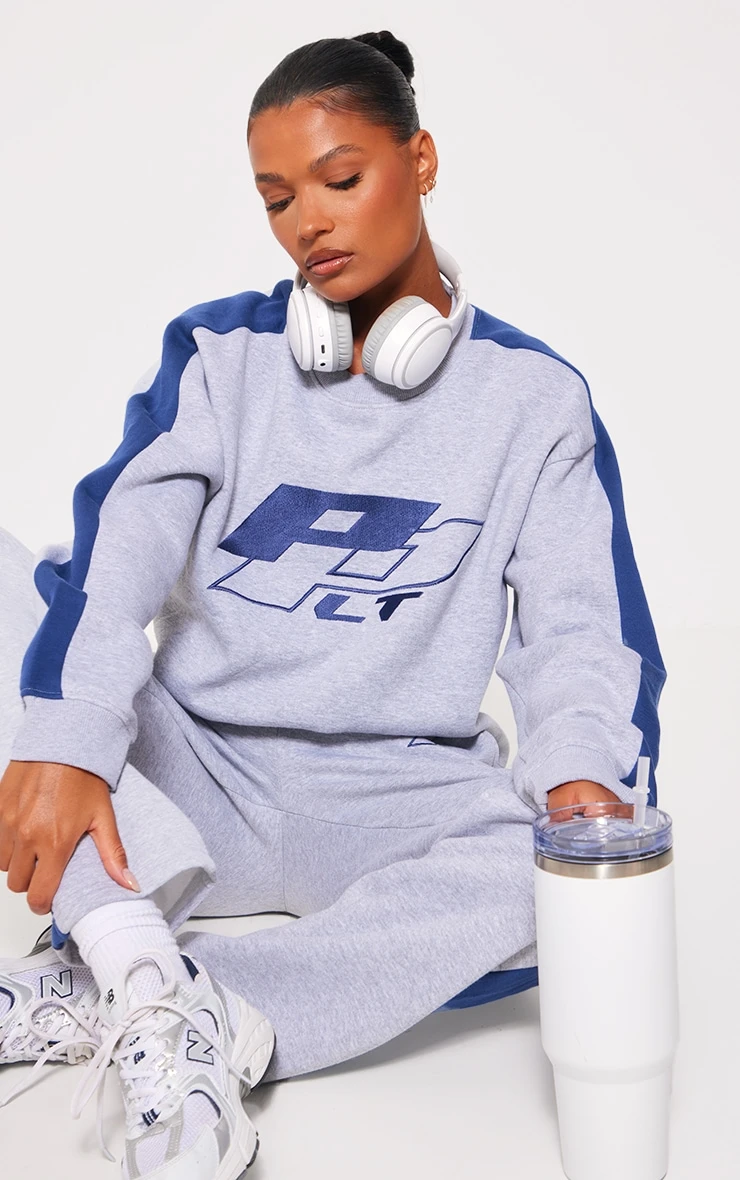 Prettylittlething Premium Heather Grey Sports Academy Puff Print Oversized Sweatpants Grey