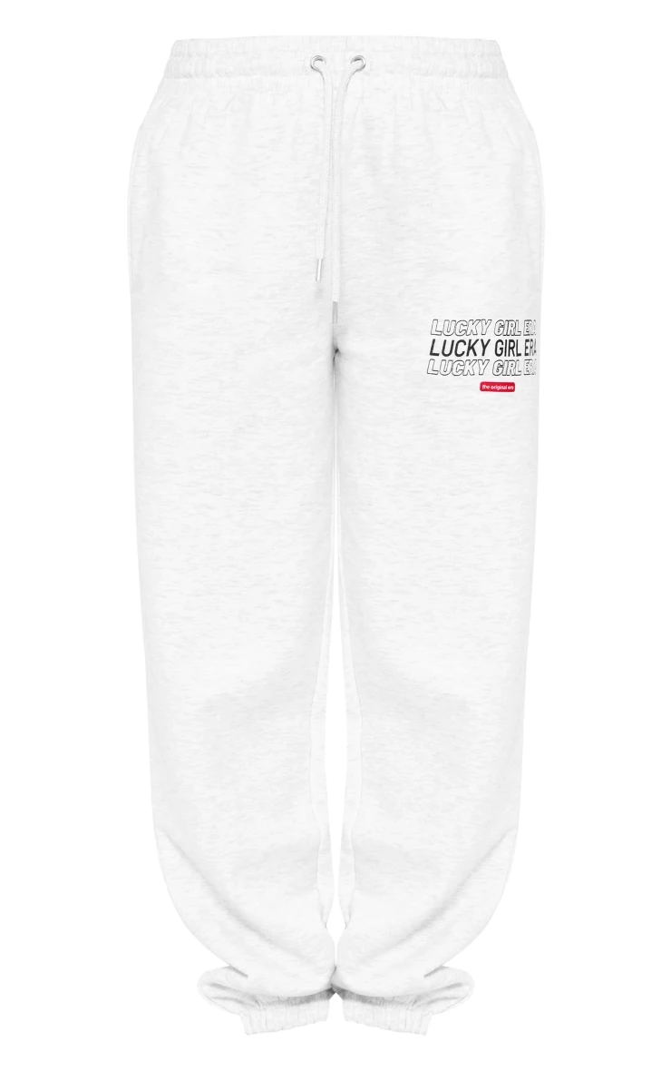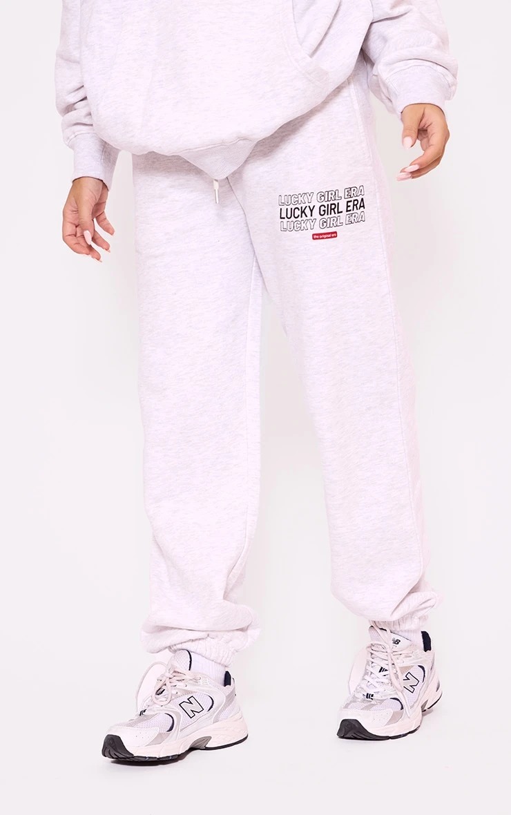 Give your off-duty wardrobe a brand-new look this season with these ash grey oversized lucky girl era print cuffed sweatpants. These sweatpants are made from an ash grey hue material with a ‘Lucky Girl Era’ graphic print and cuffed ankle detail, how could you say no? Just what you need for those chilled plans, these sweatpants are sure to catch your eye. Simply add the matching hoodie, chunky sneakers and everyday accessories for a look that won’t go unnoticed.