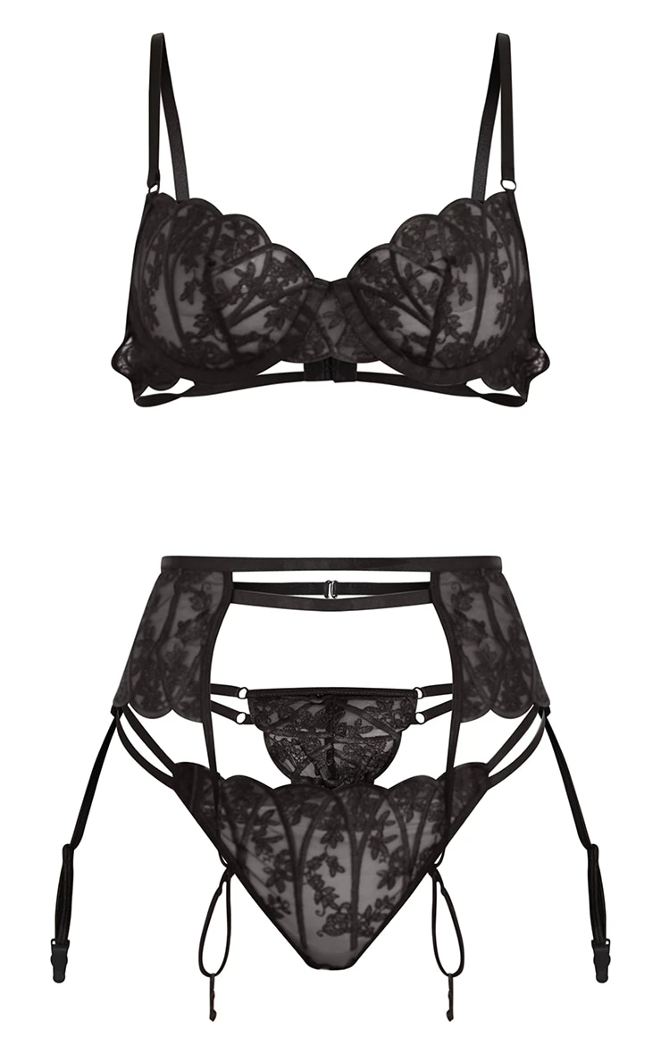 Feel totally luxurious in this lingerie set doll. Featuring an underwired bra with matching briefs and suspenders, all in a black embroidered mesh fabric. Wear under a satin robe for a look we’re loving.