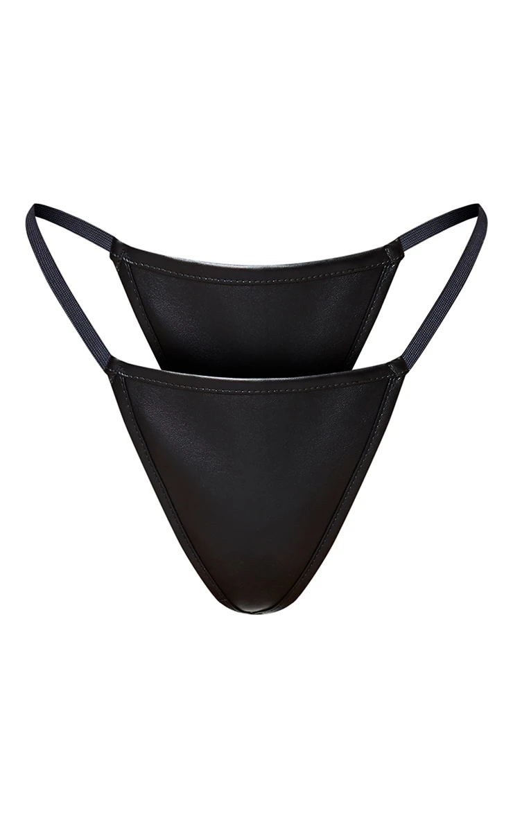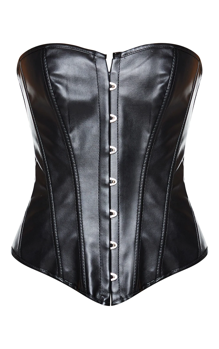 Accentuate your assets with this set doll. Featuring a black faux leather corset with hook and eye design and lace-up back detailing and the matching thong-style bottoms. Dare to wear solo or under your outfit of the day.