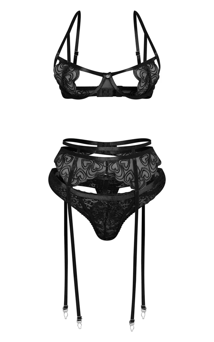 Raise temperatures and set hearts racing in this dreamy three-piece set doll. Featuring a bra, suspender belt and thong, all in a matching black lace material with a heart embroidery design, how dreamy? Team with your fave accessories to complete the look.