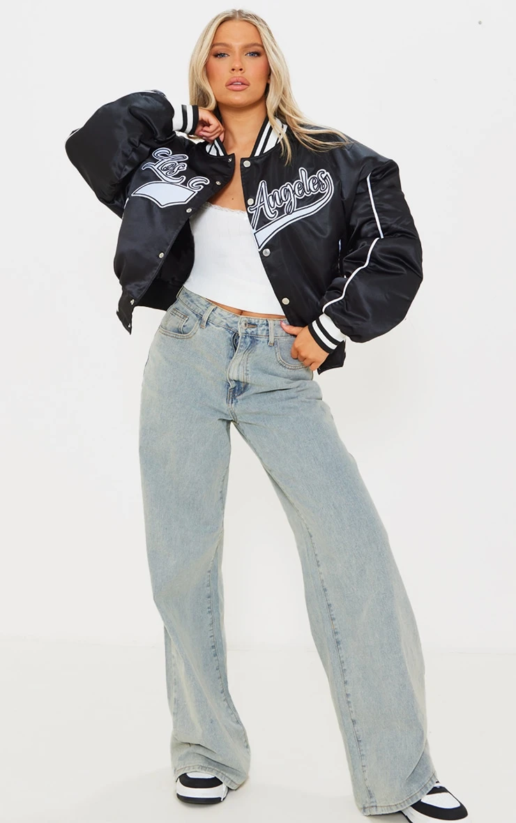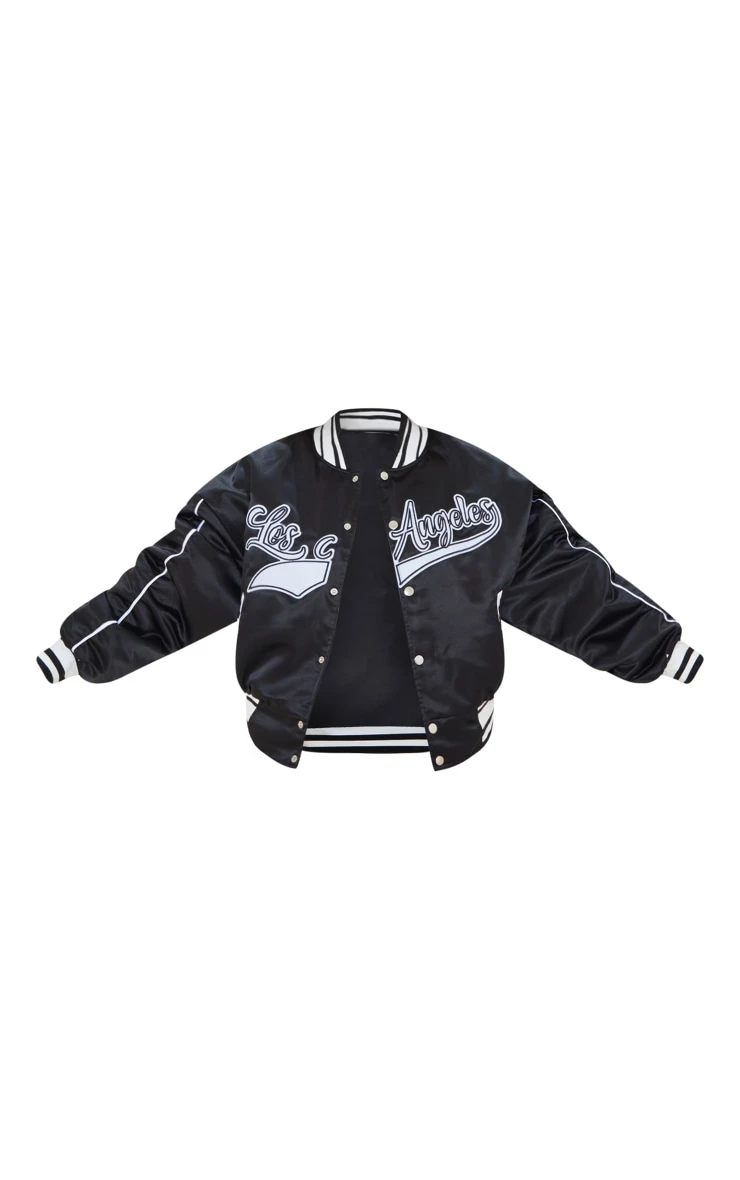 Be the first to review “Prettylittlething Black LA Graphic Front Contrast Satin Bomber Jacket Black” Cancel reply