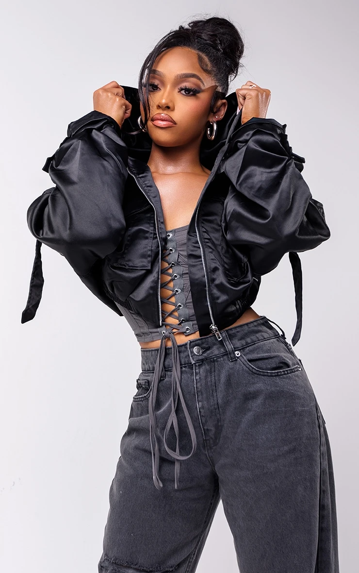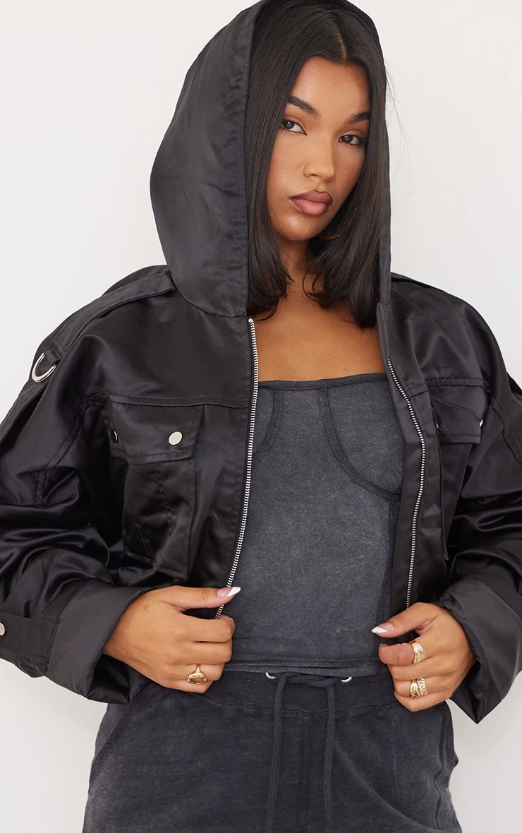 Be the first to review “Prettylittlething Black Satin Oversized Hooded Utility Bomber Jacket Black” Cancel reply