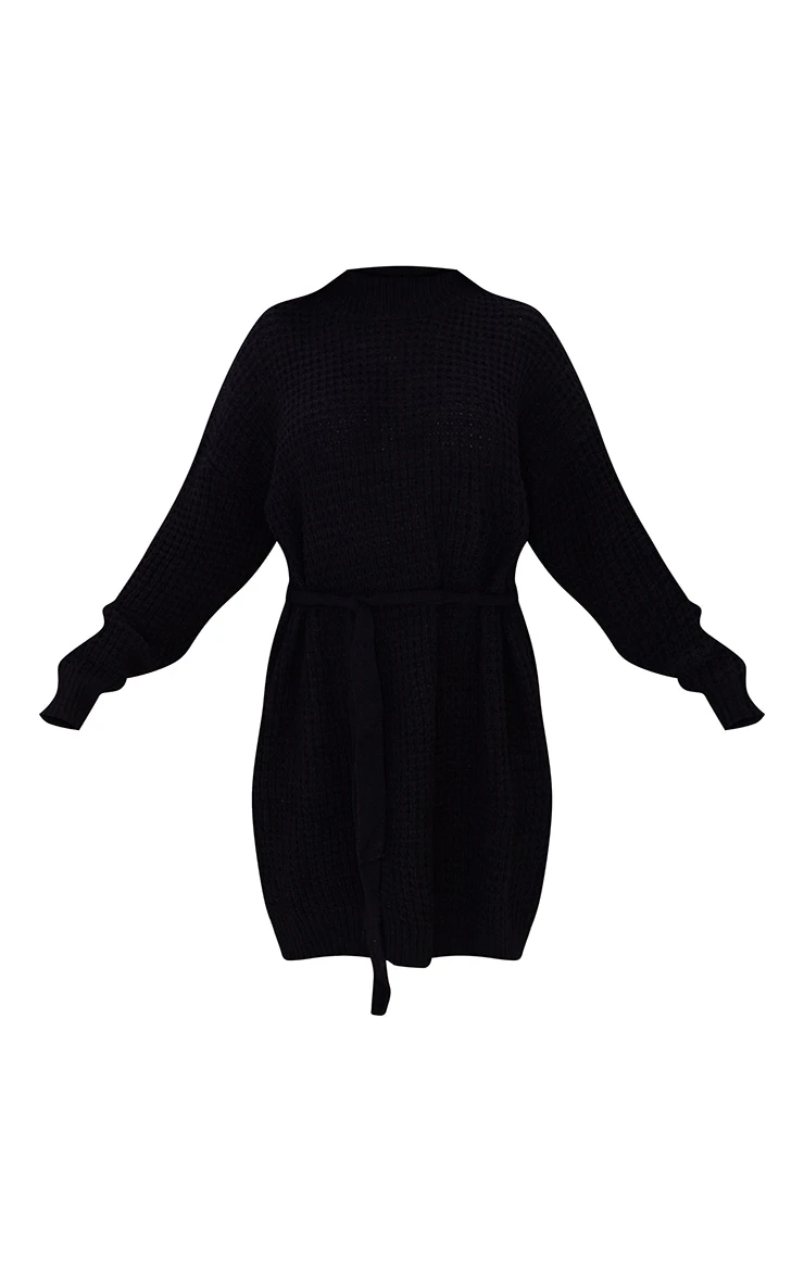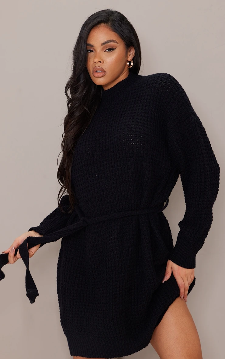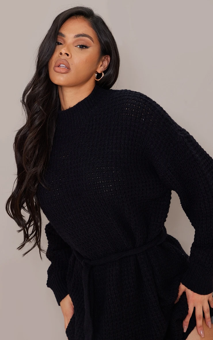 Give your wardrobe a seriously chic update with this dress. Featuring a black soft knitted material with a belted design and a comfy fit. This dress is perfect for styling seamlessly with your existing wardrobe pieces.