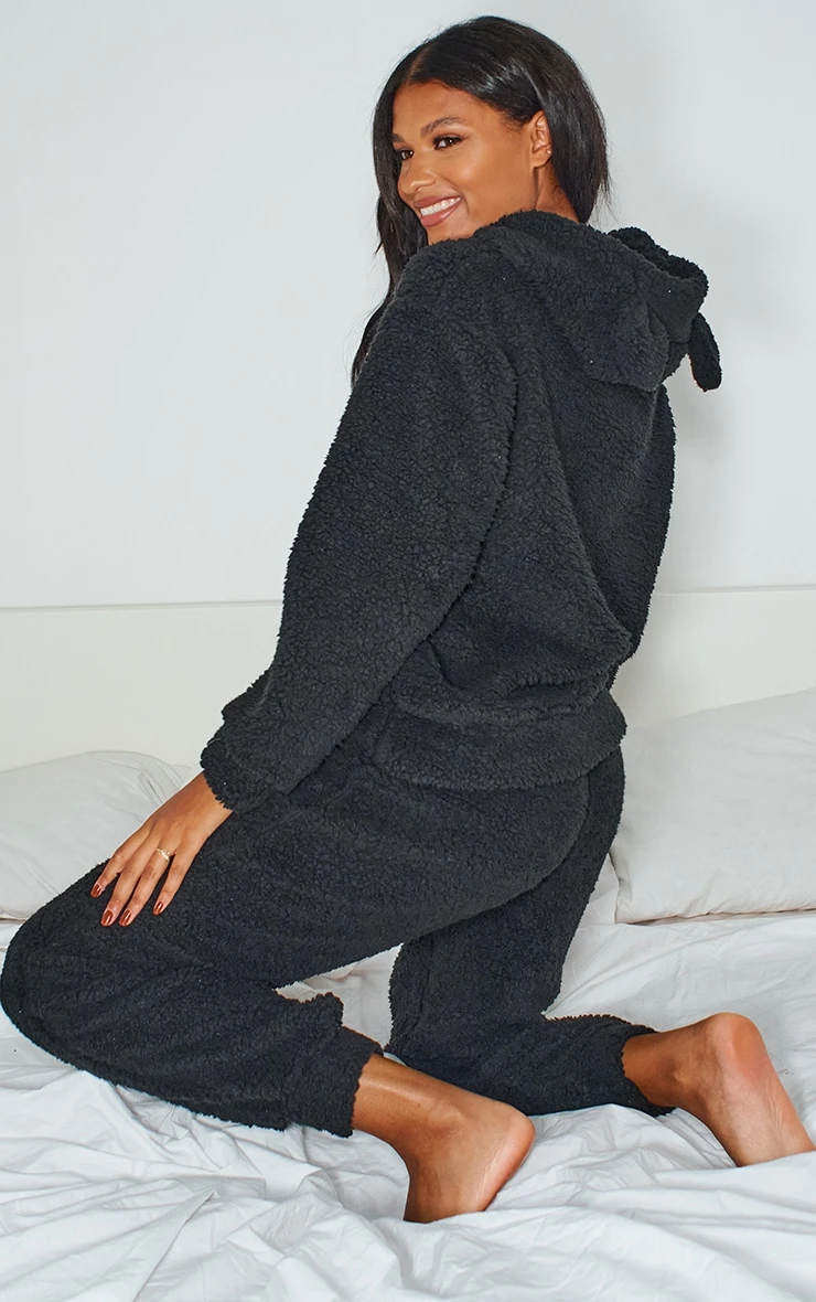 Work your lounge wear look to new levels with this set. Featuring a top with teddy ears and matching bottoms, both in a black borg fabric. Just add fluffy slippers to complete the look.