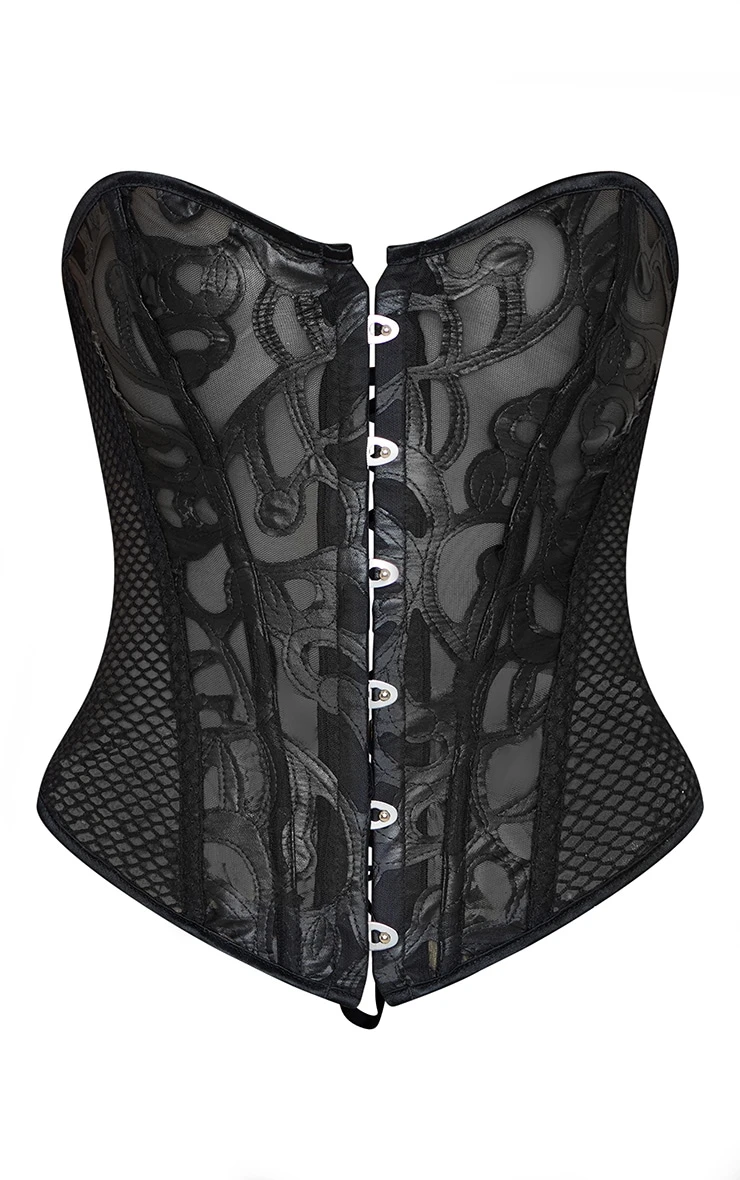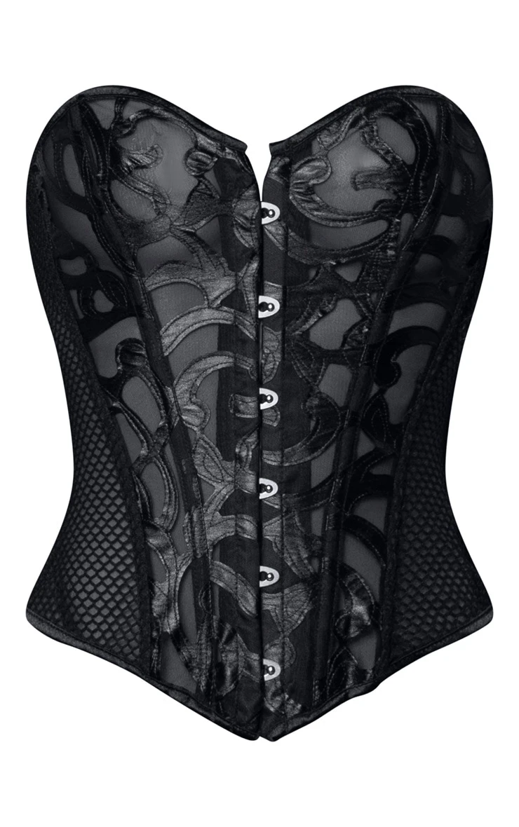This textured mesh corset is sure to give your look a fierce update. Featuring a black textured mesh lace material with hook fastenings on the front and a ribbon lace-up back, team it with a drape midi skirt and heels for a fierce weekend combo.