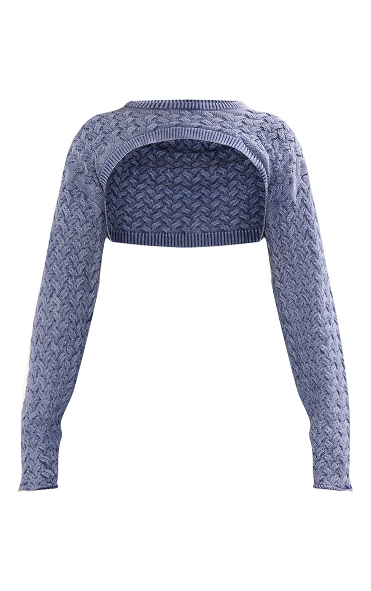 Level up your knitwear wardrobe with these blue cable knitted denim look extreme cropped sleeves. Theses sleeves are brought to you in a blue cable knit material with an extreme cropped length and long sleeves, these make the perfect layering staple doll. Wear with the matching bralette, shorts and chunky boots for a vibe that can’t be matched.