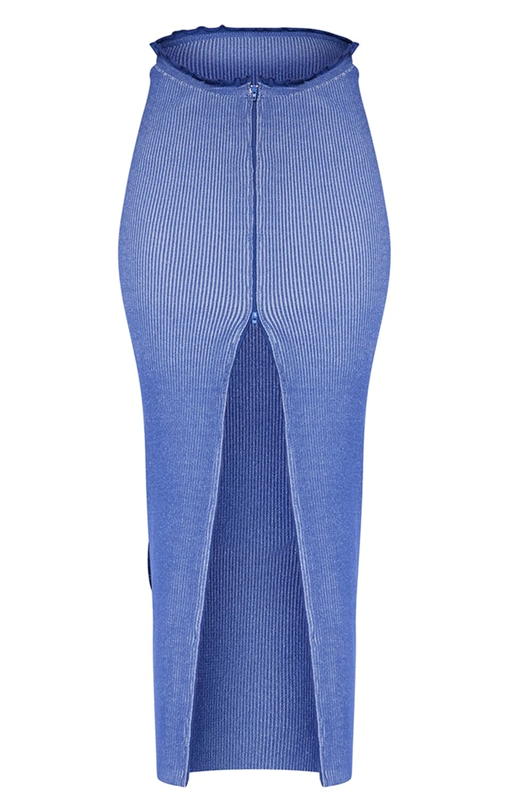 Switch up your new season style game with this blue two tone knit double zip maxi skirt, your date night with the dolls outfit is finally sorted. Made using a blue two tone knit material with a zip design and a figure-flattering fit, we’re seriously obsessed over this skirt. Style this maxi skirt with the matching top, clear slip-on heels and minimal accessories to have all eyes on you.