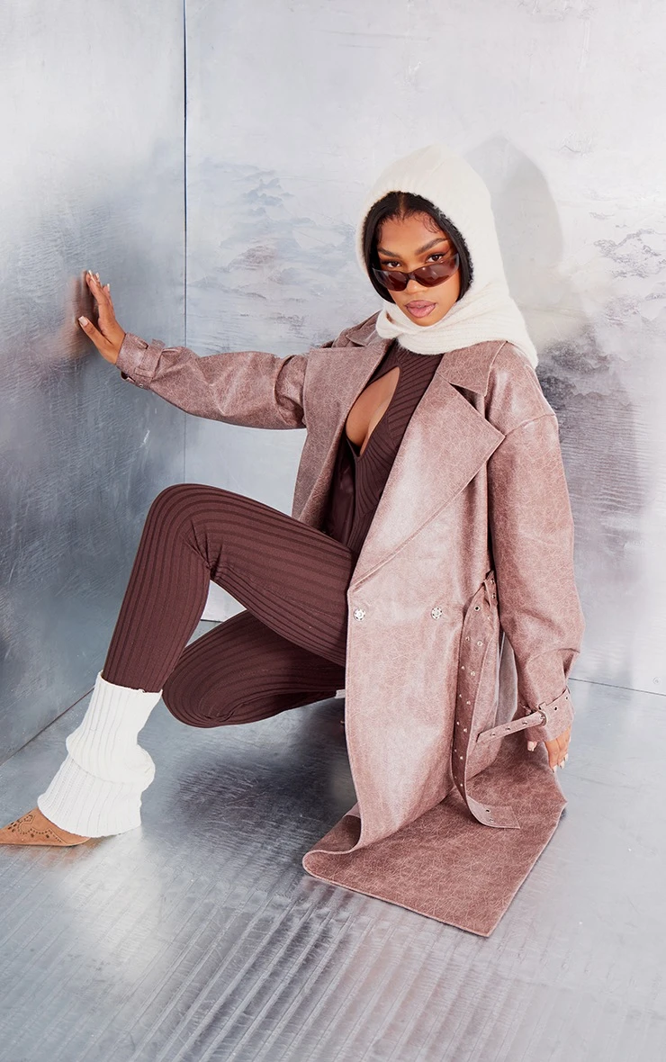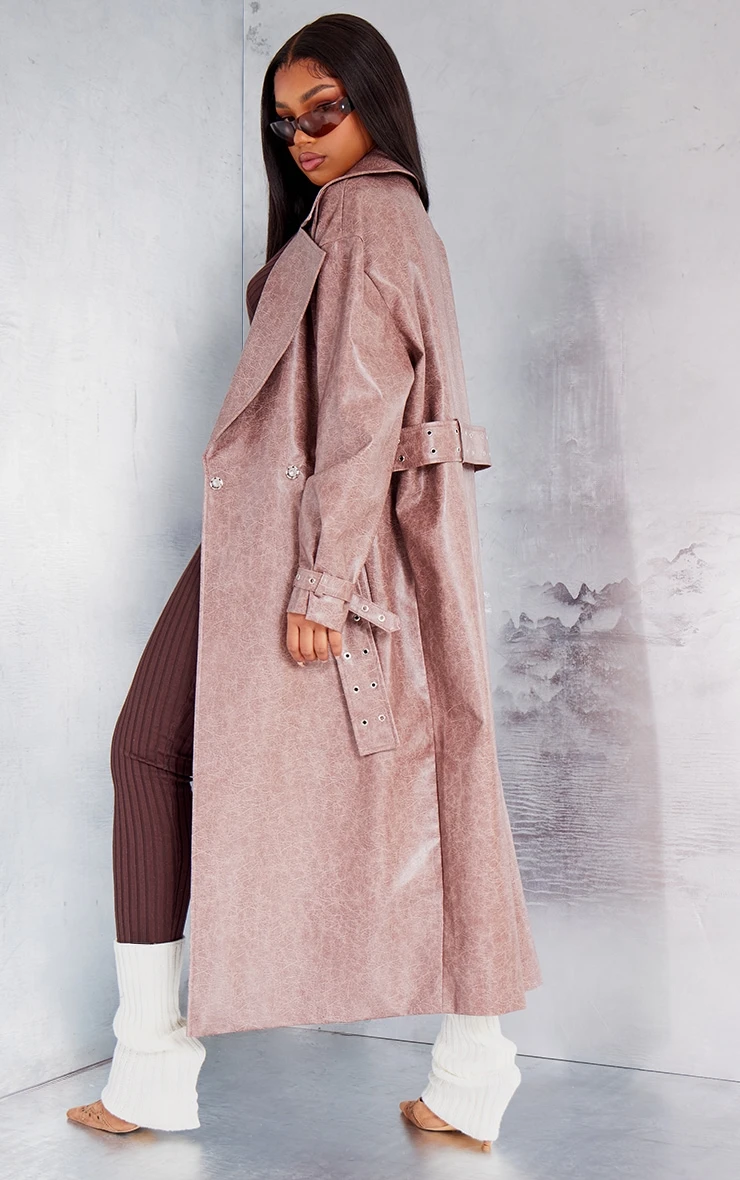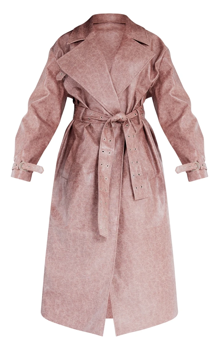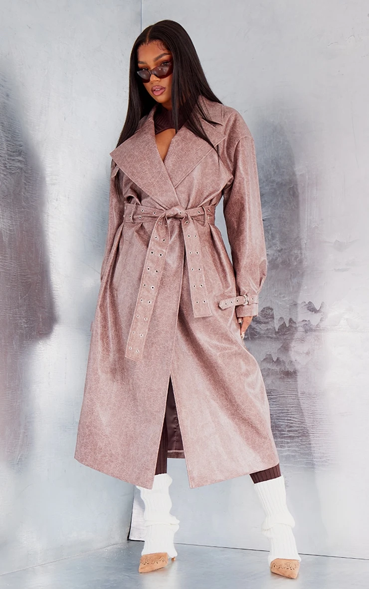 Be the first to review “Prettylittlething Brown Distressed Faux Leather Eyelet Belted Trench Coat Brown” Cancel reply