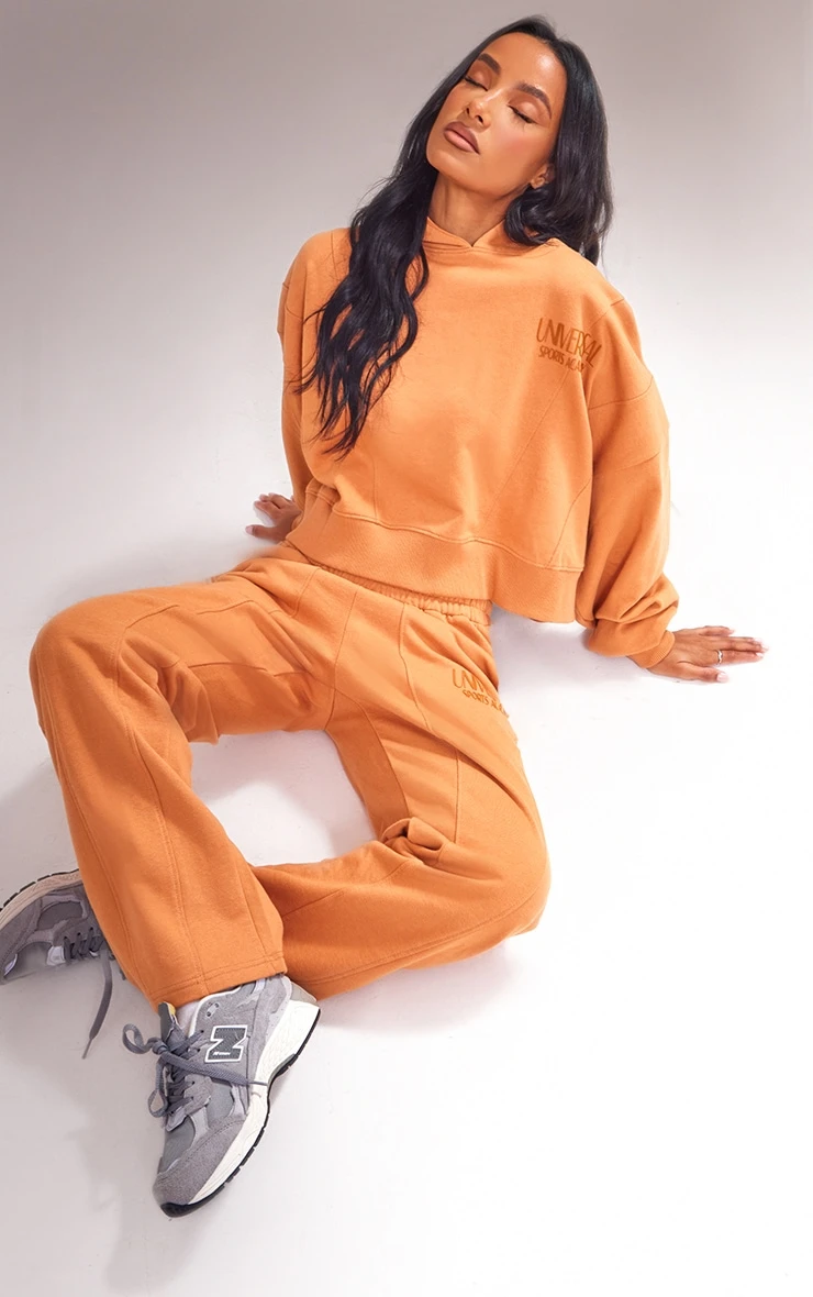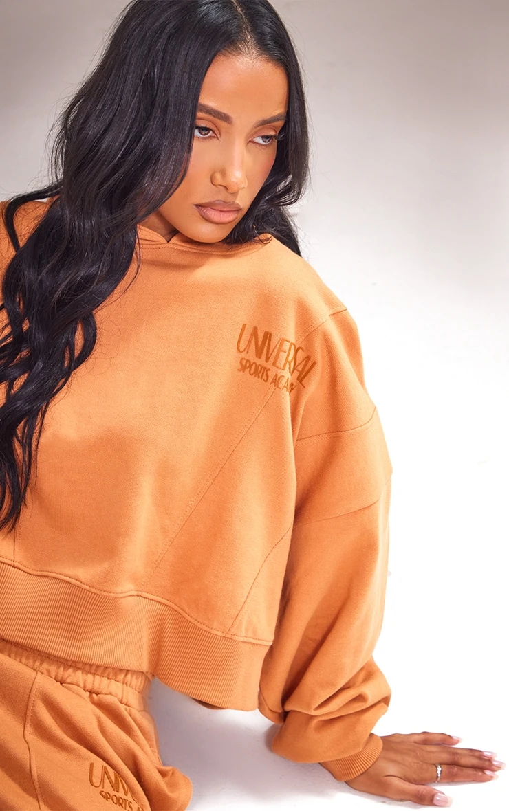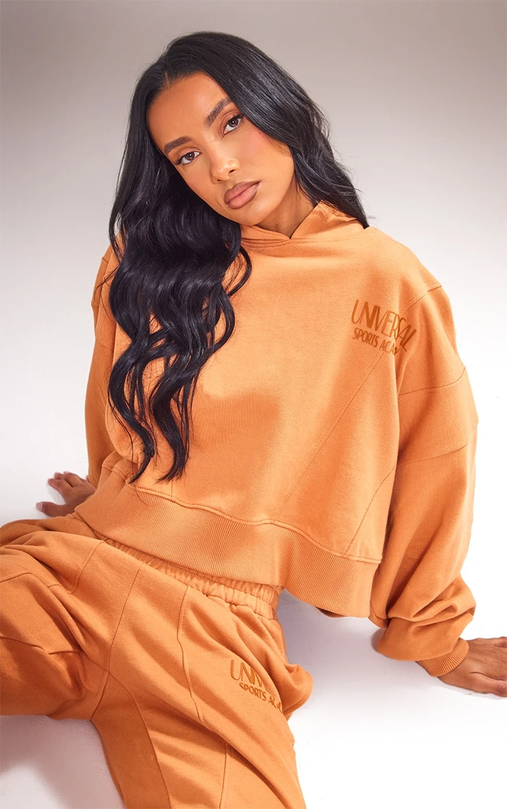 Bring all the chilled vibes to your outfit of the day with this burnt orange premium tonal print panelled boxy hoodie doll. Brought to you in a burnt orange hue material a ‘universal’ graphic print and a boxy design, how could you say no? This hoodie is the perfect addition to your wardrobe this season and we know you won’t be able to resist adding it to your basket. Team with the matching sweatpants, chunky kicks and gold accessories for a look that will gain all the compliments.