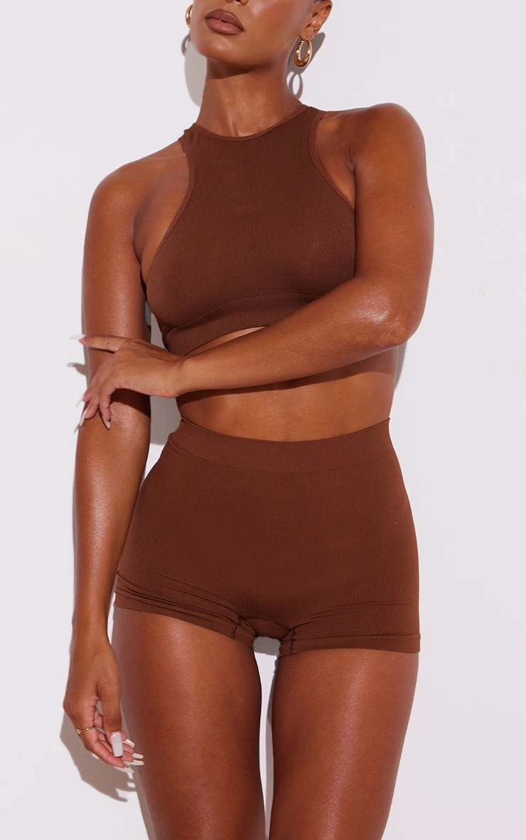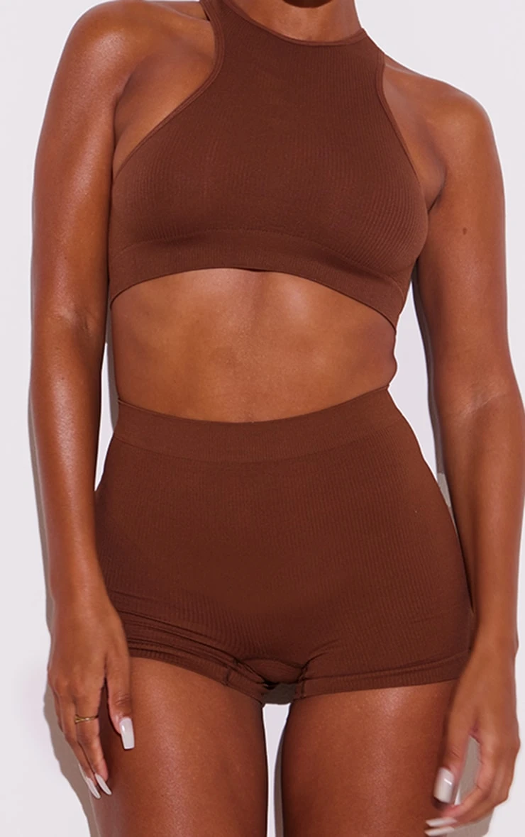 Amp up your chill day collection with these shorts doll. Featuring a chocolate rib material with a seamless design, what’s not to love? Team with the matching crop top and slides to complete the look.