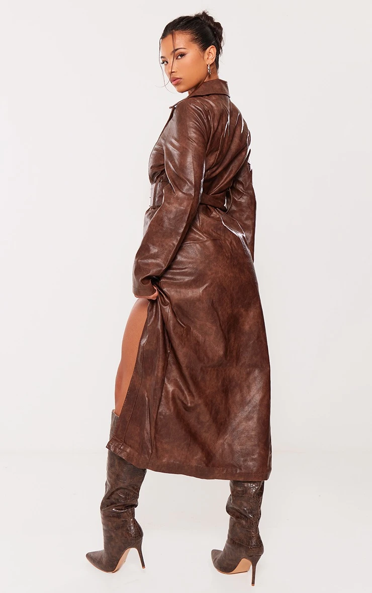 Stand out from the rest with this dark brown distressed faux leather belt detail tailored coat. Brought to you in a dark brown faux leather material with a distressed design, what’s not to love? Its belt detail and tailored fit are all you need to feel seriously chic. Style with some knee high heeled boots and a mini skirt for an Insta worthy finish.