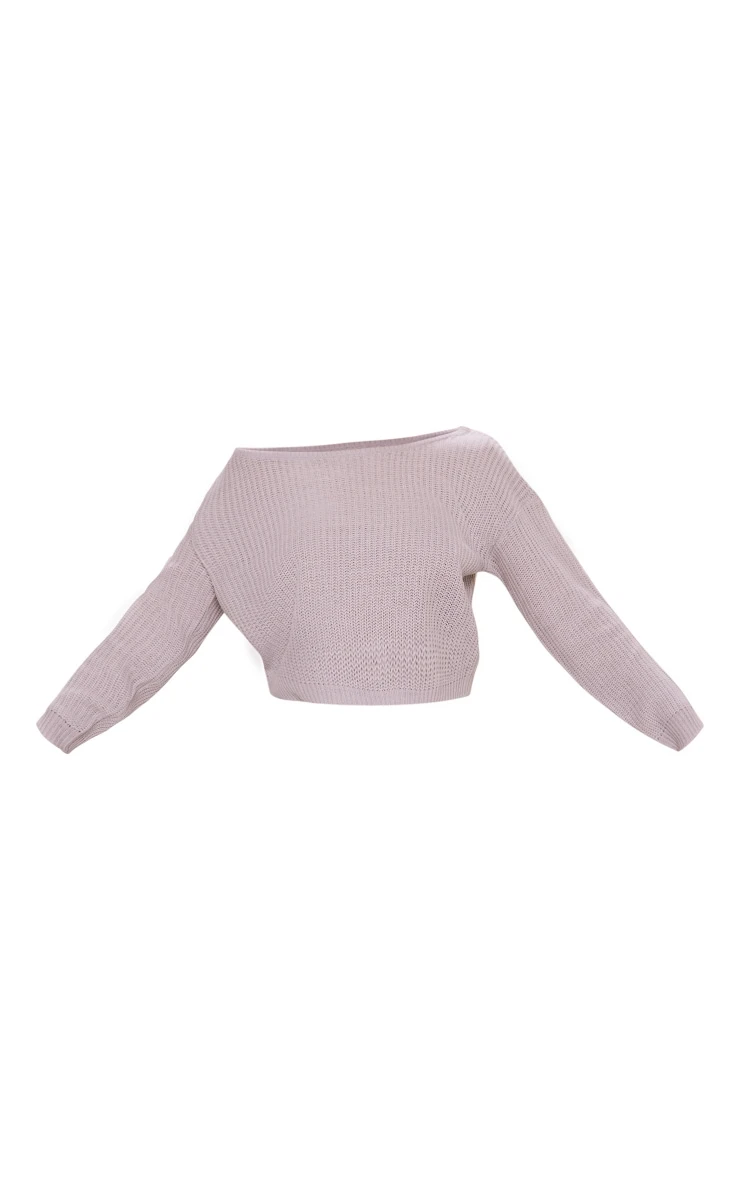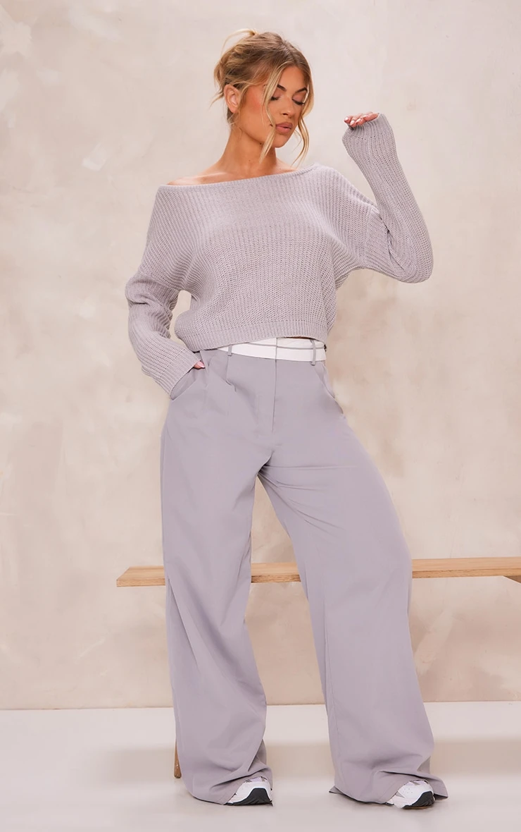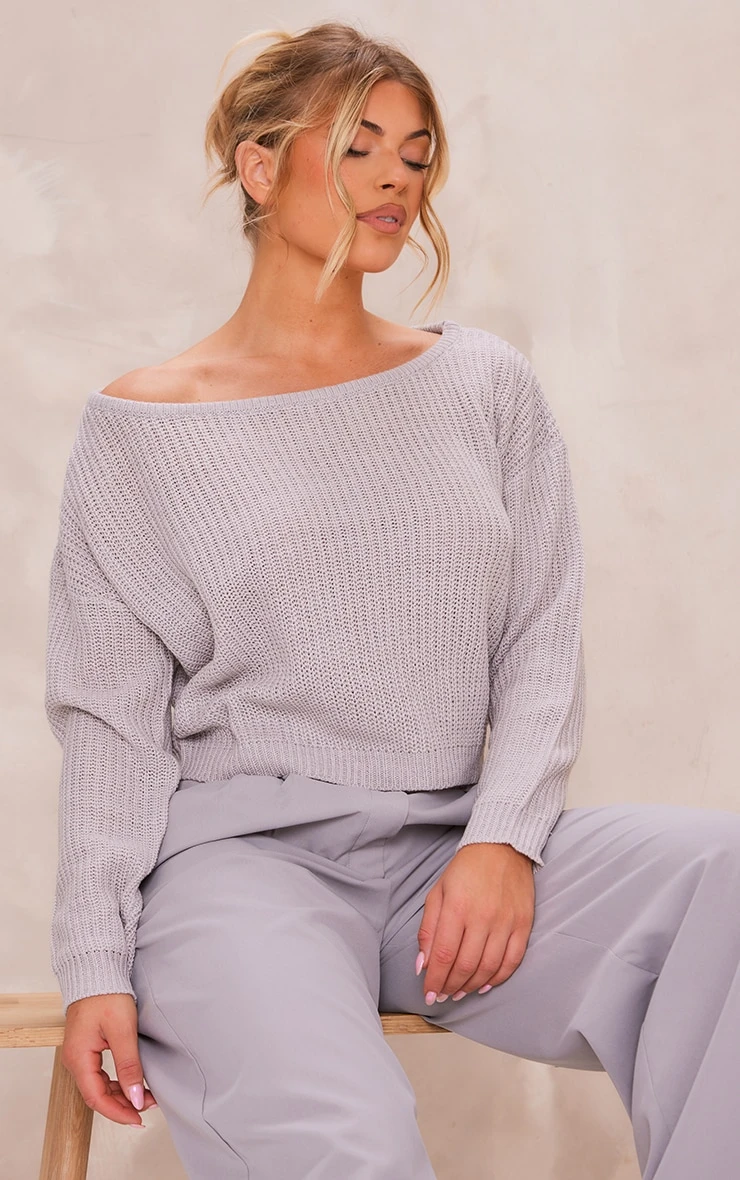 Freshen up your knitwear collection with this grey sweater. Featuring a flattering off shoulder style with a thick knitted fabric. Team this with high waisted jeans and chunky wedges for a fresh new season style.