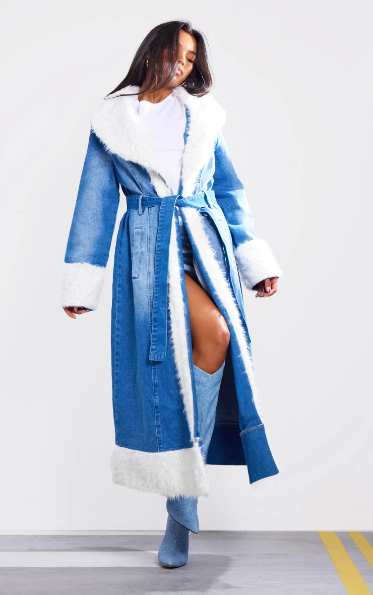 Go for all the luxe vibes this season with this indigo blue wash faux fur trim contrast denim maxi coat, you’re sure to be earning all the compliments doll. This coat features an indigo blue wash denim material with faux fur trim detailing and a maxi length, how could you say no? Pair this maxi coat with your fave outfit of the day for a look no one will forget.