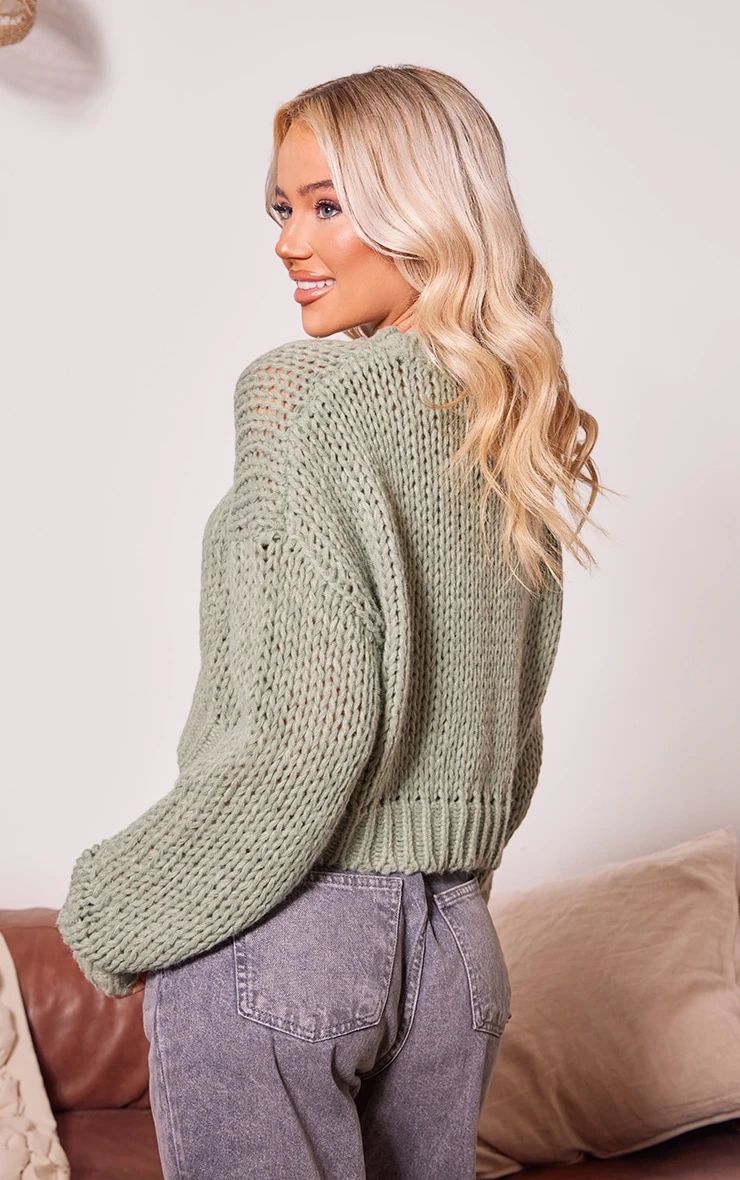 Say hello to your new season staple with this khaki extreme chunky knitted cropped sweater. Brought to you in a khaki knitted material with an extreme chunky design, how could you say no? Its cropped length adds all the edge, perfect for your everyday outfits and beyond. Style effortlessly with your go-to jeans and a pair of ballet shoes for a look that will turn heads for all the right reasons.