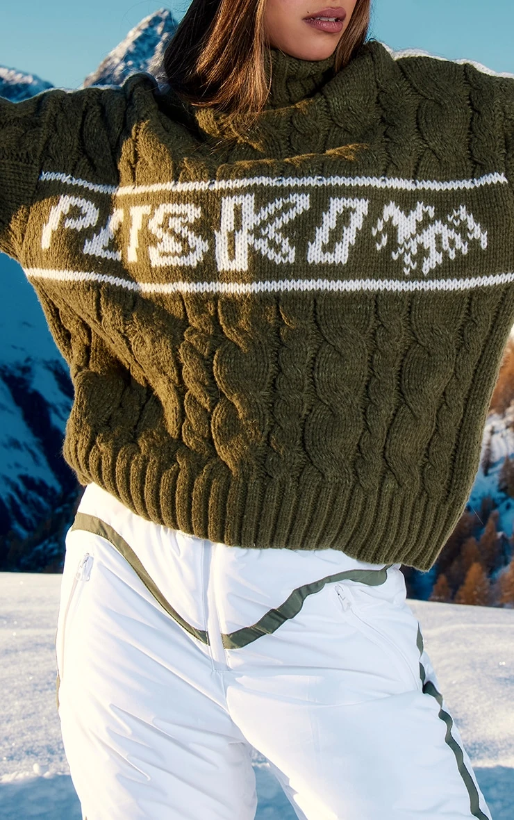 Keep comfy this season with this PrettyLittleThing khaki jacquard Apres ski oversized sweater. Brought to you in a khaki jacquard material with an ‘Apres Ski’ design, you are sure to be the best dressed on the slopes this season. Its oversized fit is all you need to set major trends. Team with some comfy boots and your go-to pants for a fool-proof finish.