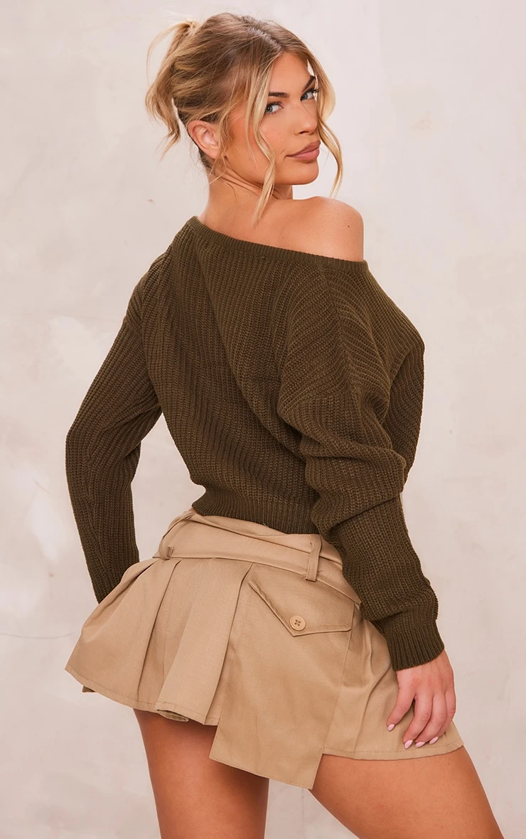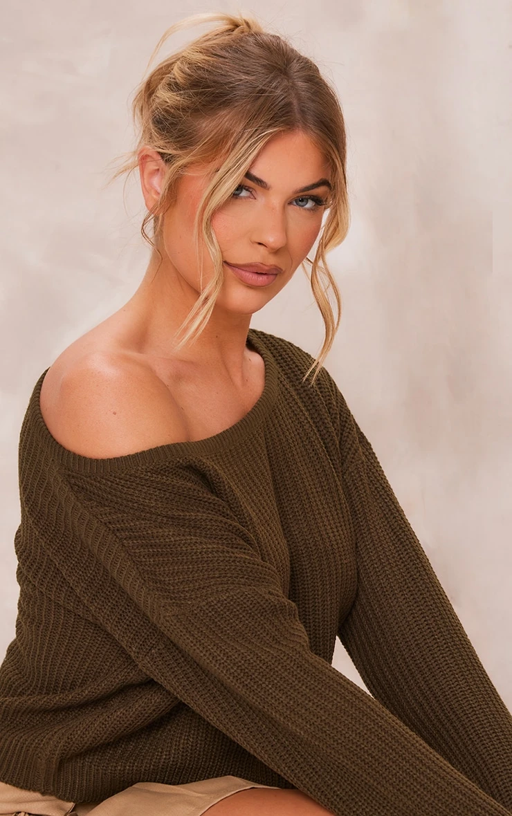 Add this hella lit sweater to your casual collection this season girl. Featuring a khaki knitted fabric in an off shoulder flattering style. Team this with high waisted jeans and ankle boots for a fresh new season style.