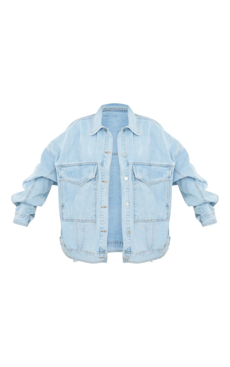 Finish your outfit of the day effortlessly with this jacket doll. Featuring a washed light blue denim material with a shoulder design and an oversized fit, it is perfect. We love it teamed with split hem jeans and a crop top.