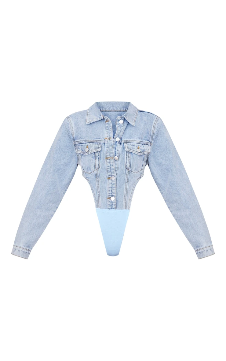 Switch up your style game with this bodysuit. Featuring a light blue wash denim material with a pocket front detail and a high side design. Wear with blue jeans and clear heels for a chic, double denim fit.