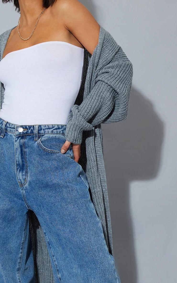 Layer up any look with this must-have cardigan. Featuring a light grey knit material with a maxi length and relaxed fit, we are obsessed. Team this with your off-duty pieces for a combo we’re loving.