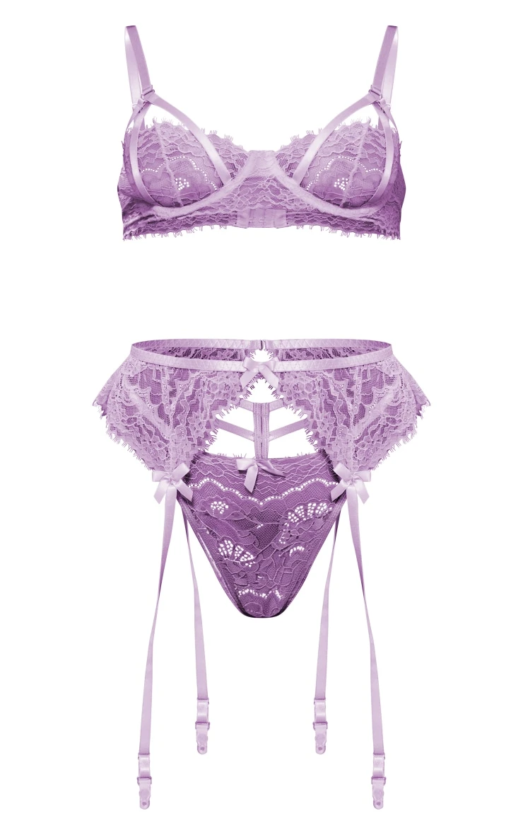 Simple but chic, this lilac cut out lace scalloped edge detail 3 piece lingerie set is essential for the new season and beyond. This set features a top, matching panties and a suspender belt all in a lilac lace material with scallop edging and a cut-out design. What more could you ask for? Team this set with all your fave accessories for a flawless finish.