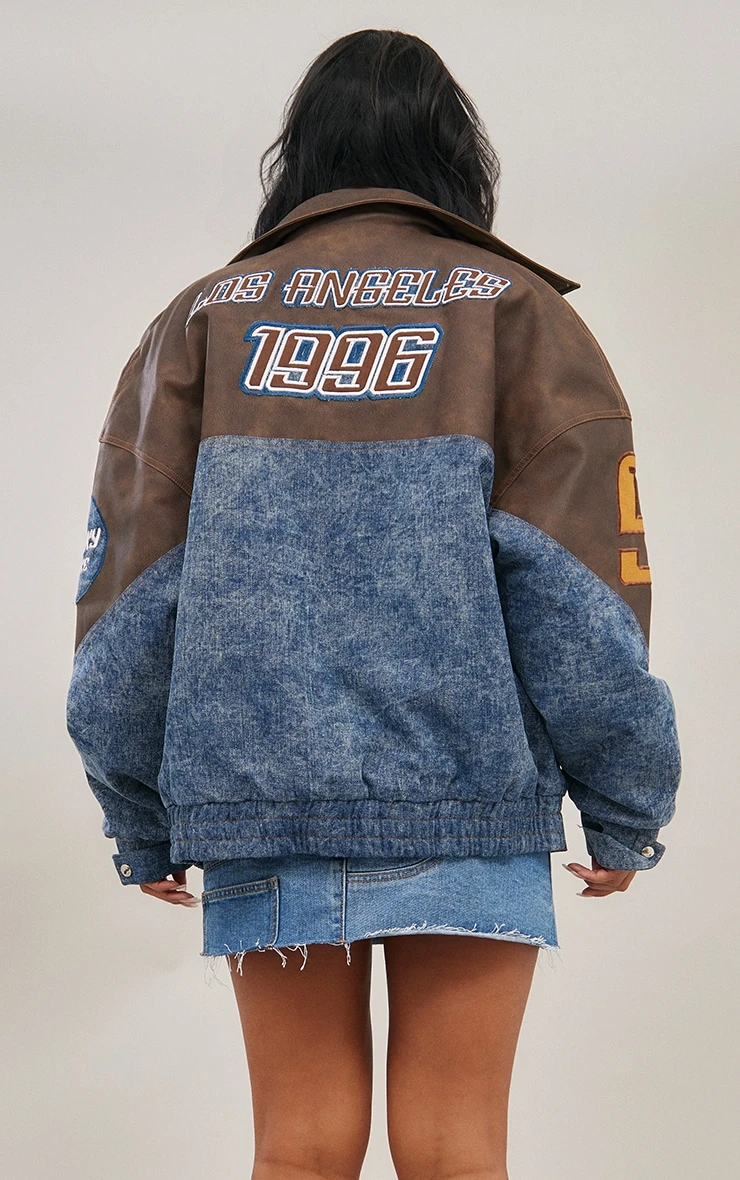 Be the first to review “Prettylittlething Mid Blue Wash Denim Faux Leather Mix Badge Detail Bomber Jacket Mid Blue Wash” Cancel reply
