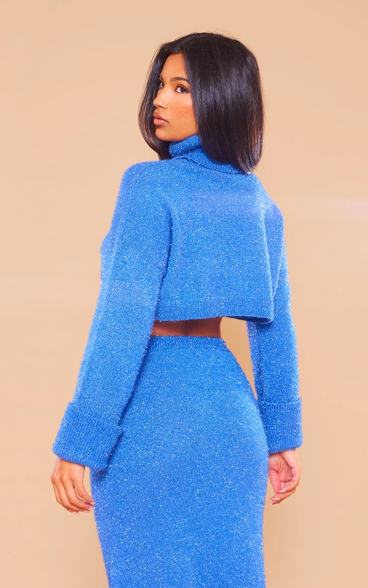Give your new season wardrobe a luxe upgrade with this midnight blue tinsel knit high neck oversized sweater, get ready to earn all the compliments. This sweater features a midnight blue tinsel knit material with a high neck design and an oversized style. Pair with the matching skirt, heels and your fave accessories to complete the look we’re loving.