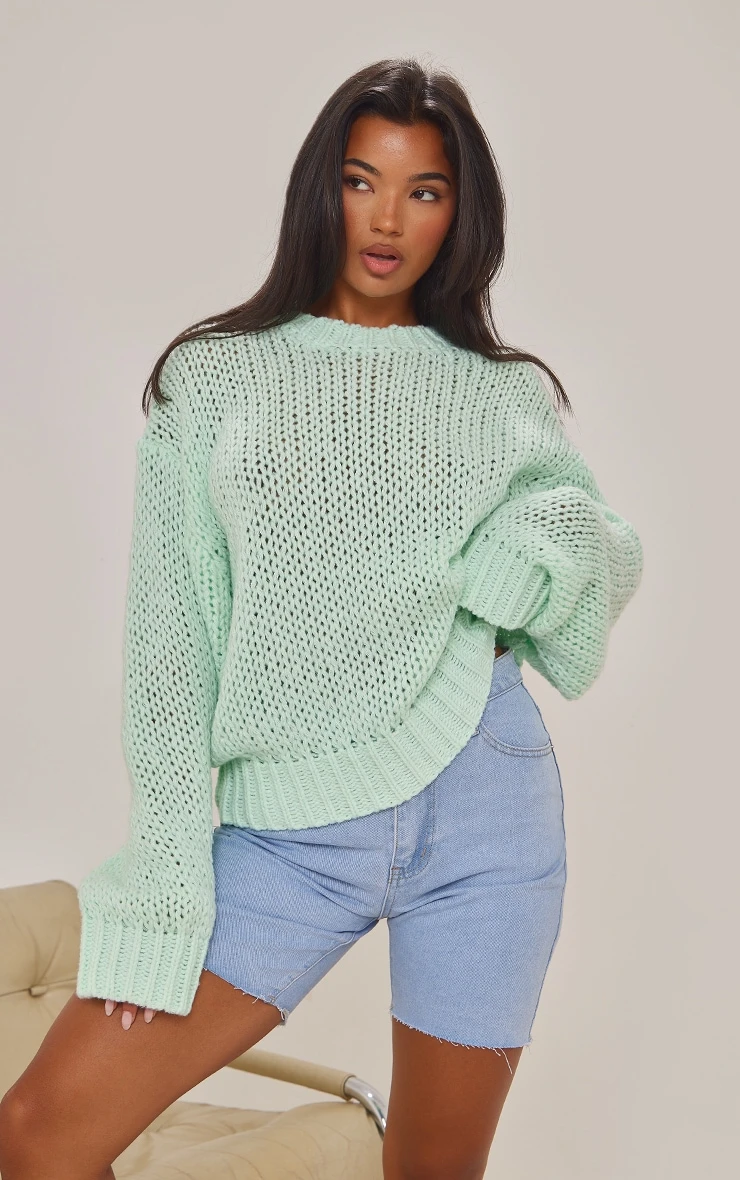 Your chilled days are in need of this mint super chunky oversized sweater. This sweater is made from a mint super chunky material with an oversized comfy fit, how could you say no? Whether you’re spending the day relaxing at home or running errands, this sweater needs to be your go-to. Style it with shorts, box-fresh kicks and accessories for the perfect off-duty fit.