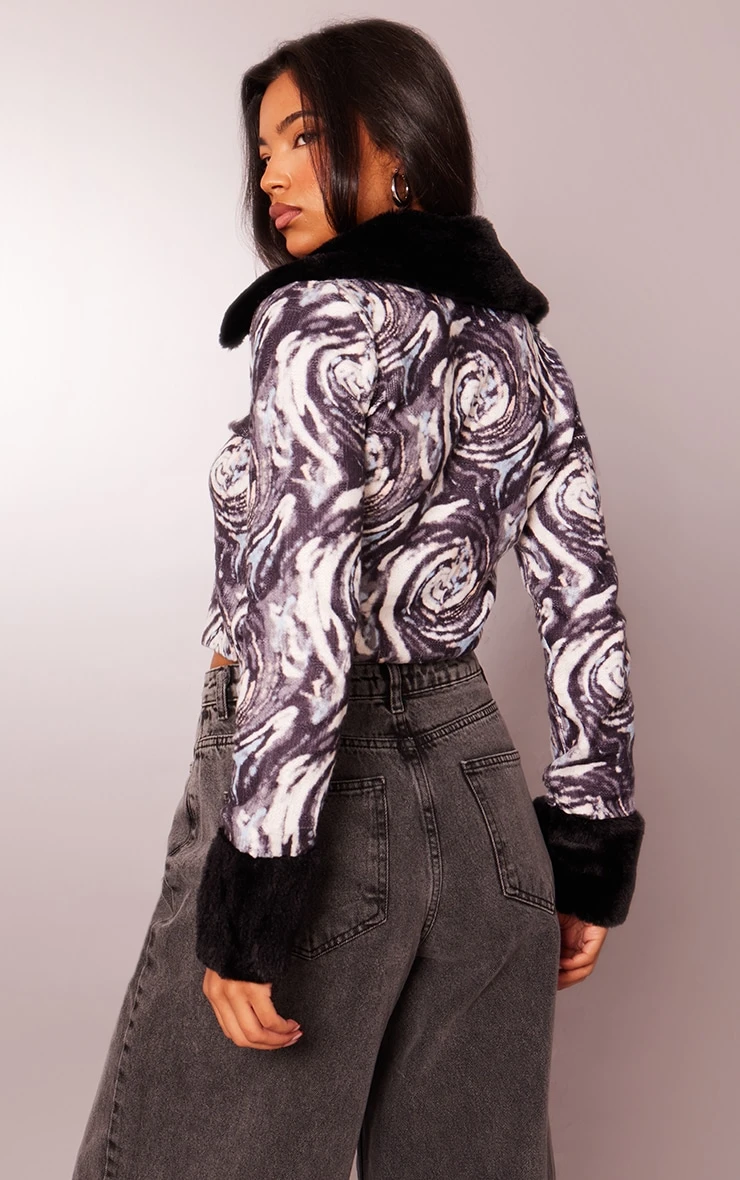 Get maxing out your off-duty wardrobe with this monochrome swirl print faux fur zip up knit doll. Brought to you in a monochrome knit material with a swirl print design and a zip-up fastening, how could you say no? Earn some extra styling points by teaming this with black denim jeans, chunky sneakers and simple accessories for a chic finish.