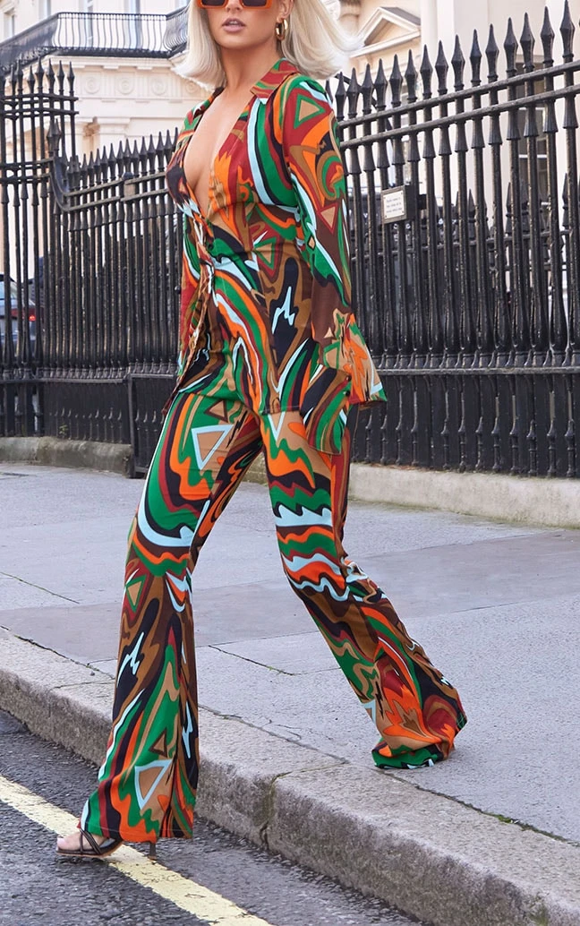 Get ready to have all eyes on you in these bottoms. Featuring a multi hue chiffon material with an abstract print and a flared design. Style these with the matching shirt and heels for a look we can’t get enough of.