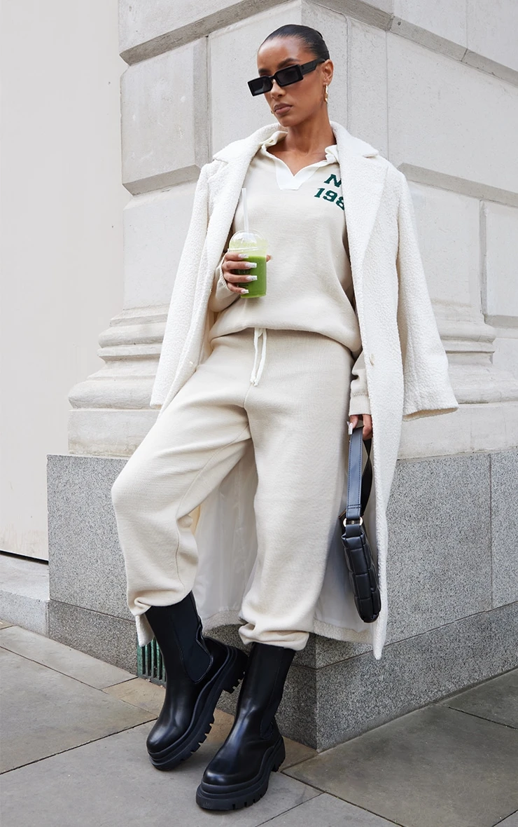 Your new season-style staple is here with these comfy bottoms. Featuring an oatmeal hue knit material with an oversized fit and drawstring detailing, we’re in love. Wear with the matching sweatshirt, black boots and a shoulder bag to amp up the look.