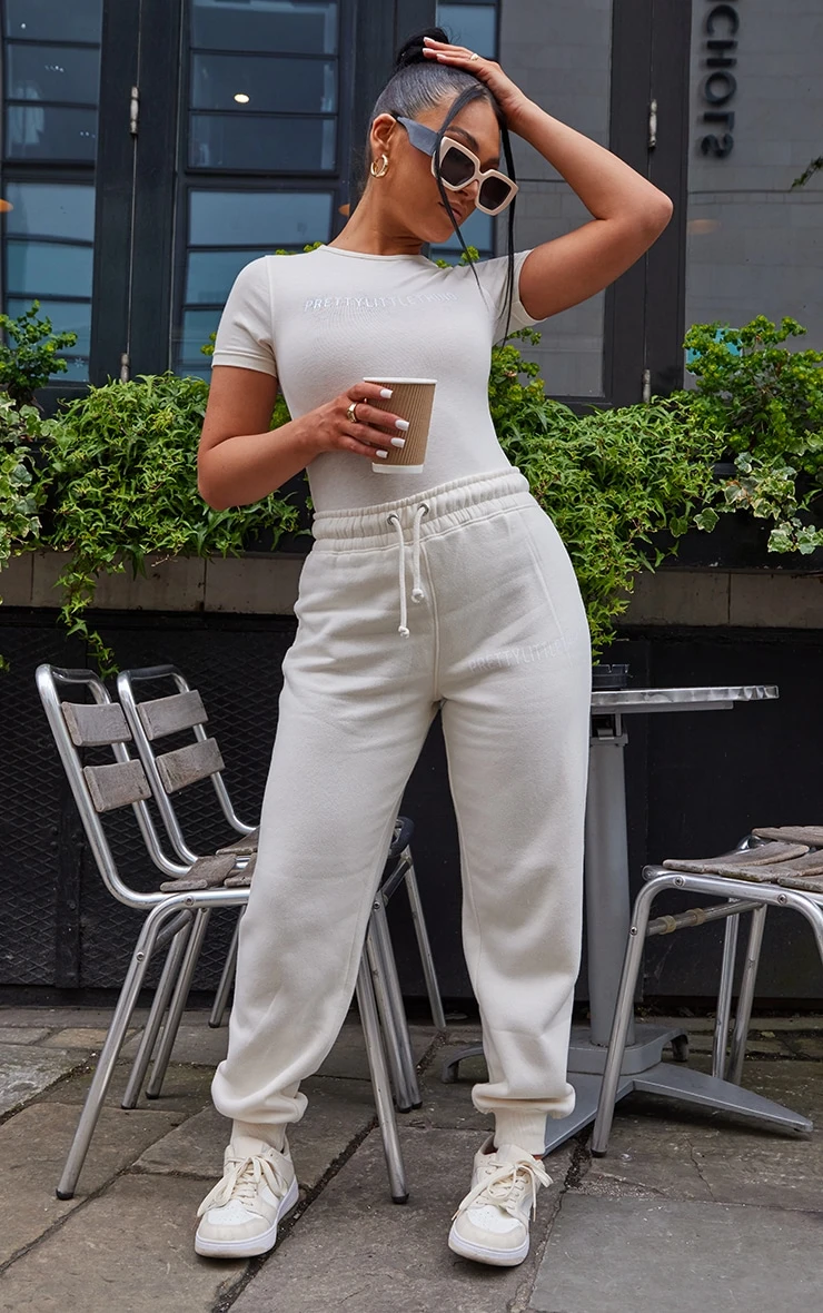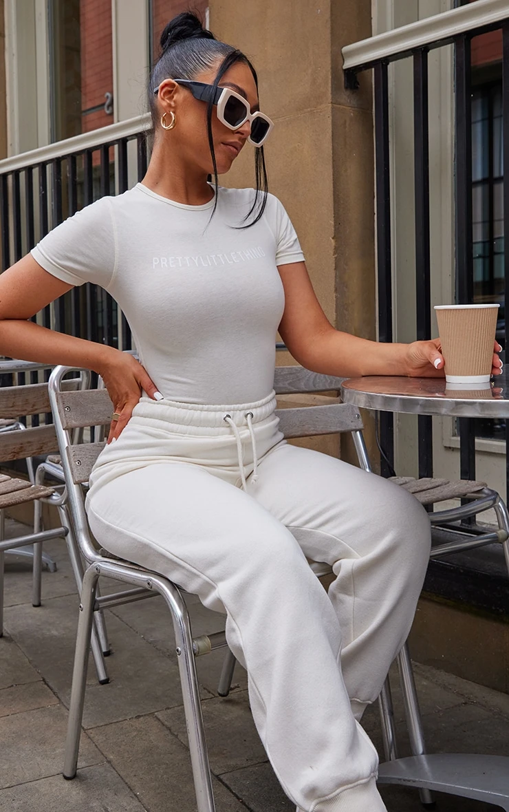 Get maxing out your off-duty wardrobe with this bodysuit doll. Featuring a recycled off white material with a ‘PrettyLittleThing’ graphic and short sleeves, it’s perfect. Team with the matching bottoms, box-fresh kicks and sunnies for an insta-worthy combo.