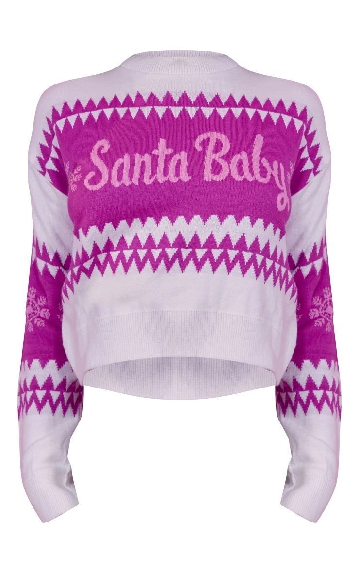 Spread some Christmas cheer with this sweater doll. Featuring a white and pink knit material with ‘Santa Baby’ graphic and a cropped length. Keep the look comfy and cosy with pink bottoms and your fave fluffy socks.