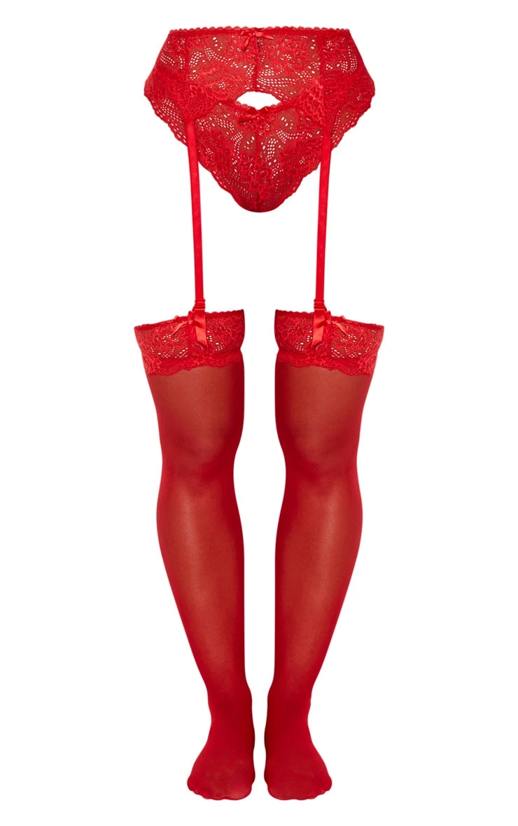 Have hearts racing for all the right reasons with these suspender stockings doll. Featuring a thong with thigh high socks, matching lace garters and attachable suspenders, all in a red lace material, what more could you want? With luxe lace detail in a fiery red hue, these women’s stockings and suspenders are sure to take your after dark look to a whole new level. We are loving these red hold ups styled with the matching bra and accessories to complete the look.
