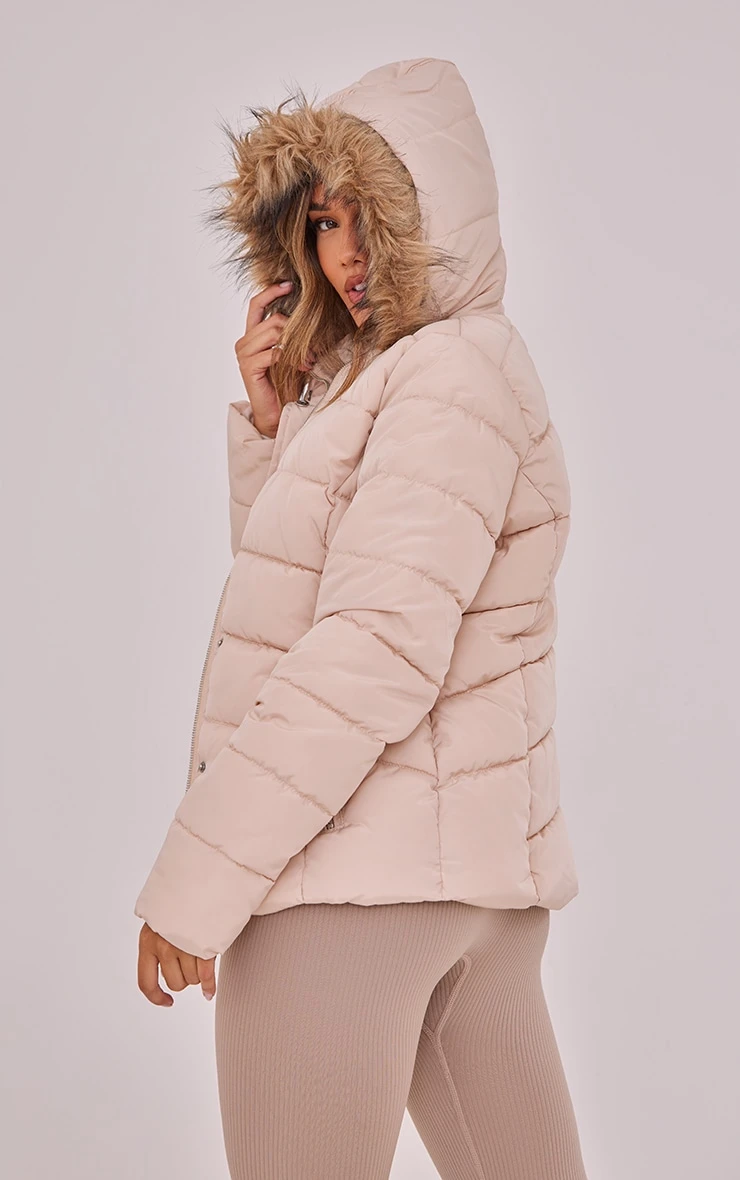 This jacket is at the top of our hit list right now doll. Featuring a stone quilted material with an oversized faux fur hood and a puffer jacket style, we’re obsessed. Team this over a nude crop top and matching hue bottoms for a cosy and chilled attire.