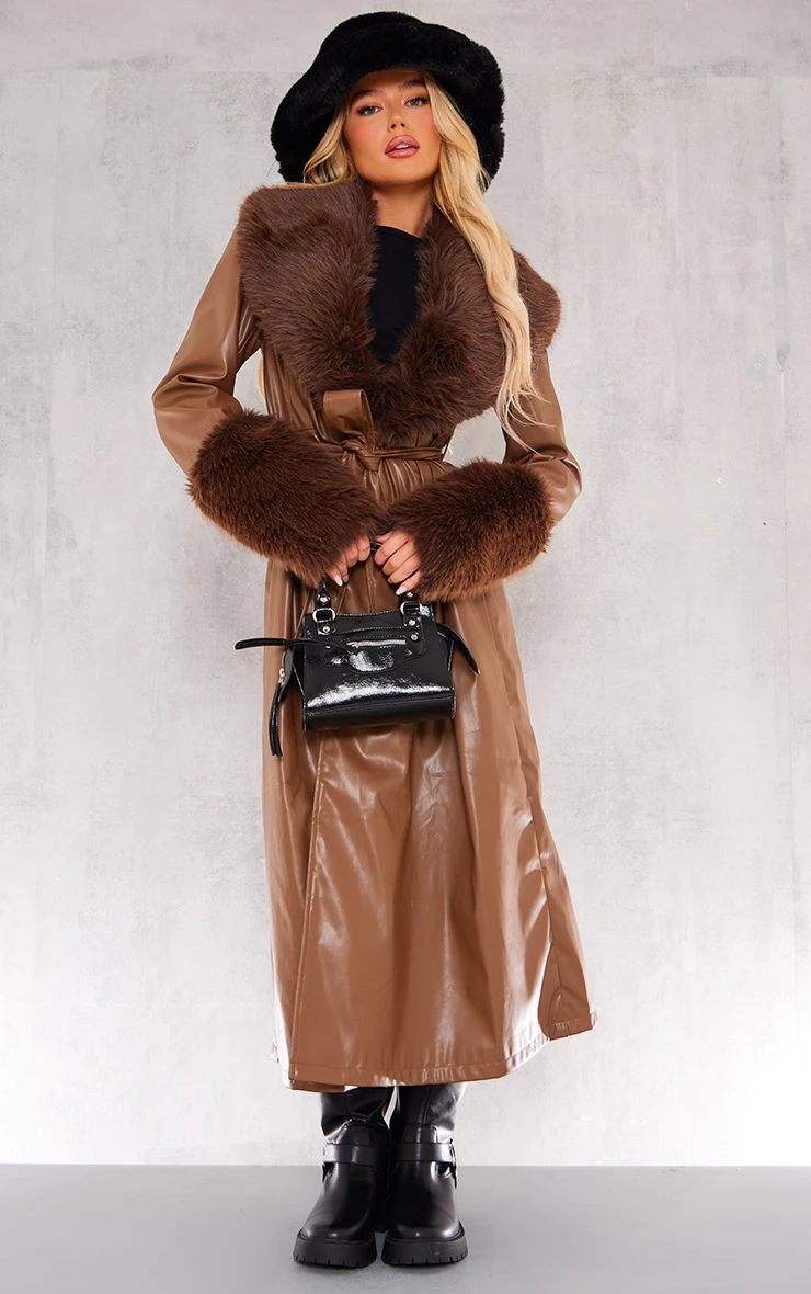 Create a look no one will forget with this unreal taupe premium faux fur trim faux leather belted trench coat, it’s a definite yes from us. This trench coat features a taupe faux leather material with faux fur trim detailing and a belt fastening, you won’t be able to resist this statement piece. Pair it with your fave outfit of the day for a look everyone will be asking about.