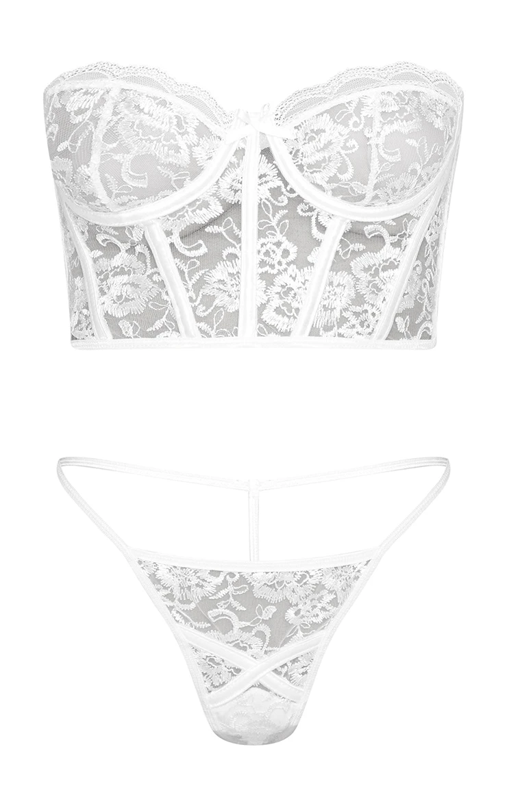 This lingerie set is sure to have you feeling confident. Featuring an underwired corset crop top with a matching thong, both in a white embroidered lace fabric. Wear this under a satin robe for a look we’re loving.
