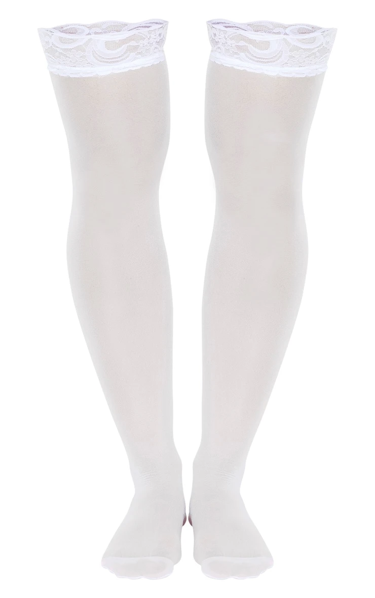 Update your lingerie collection with these hold up stockings. Featuring a white sheer fabric with a lace top detailing, team with a white bra and panties set to complete the look.
