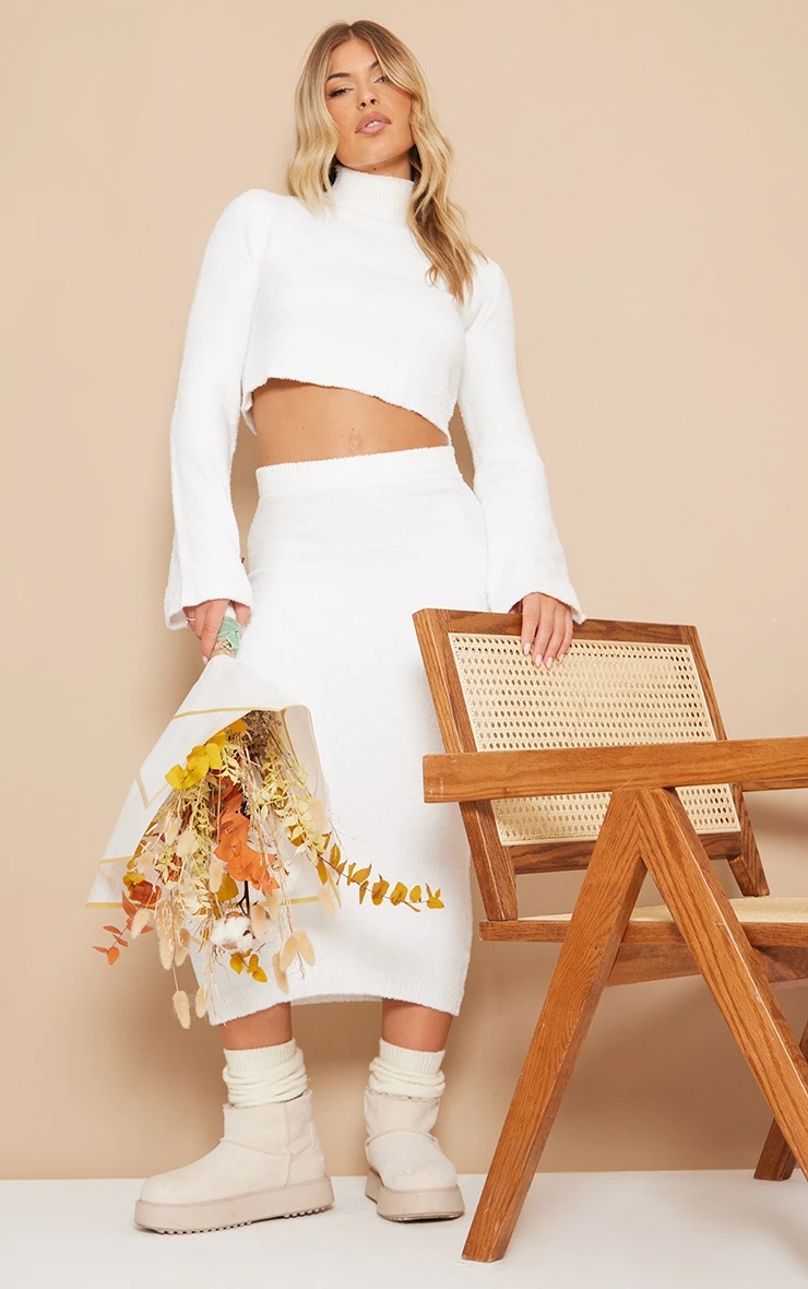 Nail the A/W vibe this season with this white towel knit super soft crop sweater doll. Its white towl knit material is super soft and cosy whilst its roll neck design adds a touch of luxe to your look. This sweater is the ultimate styling staple this season that can be dressed up or down for any occasion. Style effortlessly with the matching skirt, comfy boots and gold accessories for a look that everyone will be obsessed with.