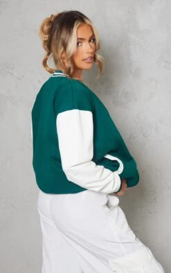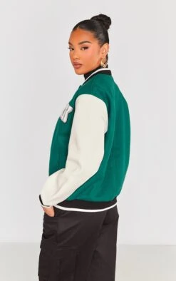 Prettylittlething Forest Green Faux Leather Contrast Sleeve Varsity Bomber Jacket Forest Green